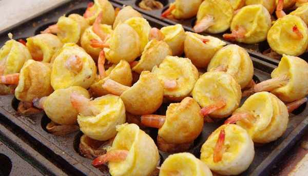 工具鍋燒熱將油倒入其中一格,多倒些然後用勺子將油分散到其他格子,這樣可以省去刷油,將醃制過的蝦仁放入格子裡煎烤著