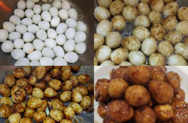 馬上放涼水泡一下再剝去殼; (鵪鶉蛋去殼盡量不要刮破蛋皮,不然炸的時候會把蛋黃炸出來),鍋裡倒油,燒至6成熱下入鵪鶉蛋小火慢慢炸,火大蛋易爆。
