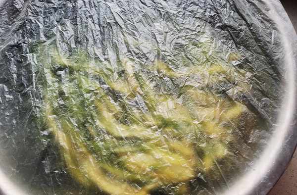 7 三天以後扯去保鮮膜,你會聞到一股非常清香的味道,把白菜放入水中,多次反復清洗幹凈,擠幹水分