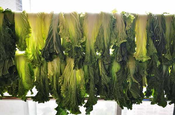 4 白菜晾曬蔫後,我把白菜放在涼臺欄桿上,繼續晾曬至七成幹