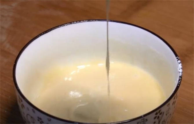 2.這個功夫我們準備點油酥,30g面粉,2g鹽,倒入熱油,攪拌成這種類似酸奶稠度的面糊,這樣油酥就做好瞭。
