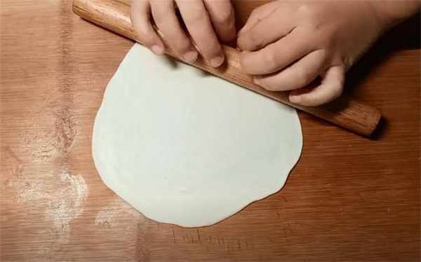 8.二次餳的面比較柔軟,直接把面劑按扁,搟成圓餅。