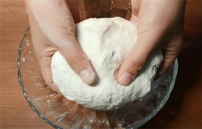6.摔打抻長,按扁排除裡面的空氣,然後從一端從外向裡卷起來,底部封口朝下,這樣一個生胚就做好瞭。
