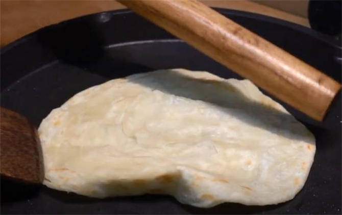 9.電餅鐺預熱刷油,開上下火,把餅皮平鋪到裡面,再次整理形狀,表面刷油,蓋上蓋子燜15秒左右,翻面繼續燜15秒,現在這個餅就已經熟瞭。