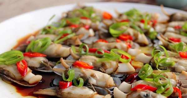 調好的料汁淋到排好隊的蟶子上;撒紅線椒薄片和蔥絲;