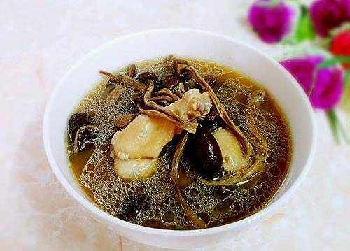 雞肉:4兩、紅棗:幾顆、茶樹菇:一紮、準山:幾片、雲苓:幾片、白術:適量、北芪:一抓、茨實:一抓、鹽:半勺子、水:6碗