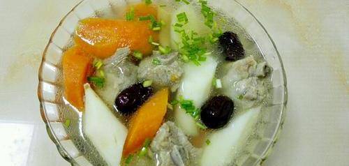 排骨:200克、紅蘿卜:一個、鐵棒山藥:150克、紅棗:5枚、黨參:10克、薑:3片、鹽:少許、雞精:少許
