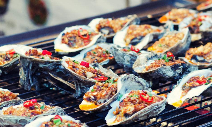 烤生蠔或者扇貝是每個夜市上的特色小吃,是用新鮮生蠔、扇貝通過炭烤而成。烤這些美食的做法非常簡單,隻需將蒜蓉、薑末、醬等佐料放入剛剛撬開的生蠔內,再直接放到火上烤熟即可,最大限度地保證瞭蠔肉,扇貝肉的新鮮還增加瞭海鮮的野味與鮮味的感覺。而且生蠔大補,是不少男士心中的第一美味。