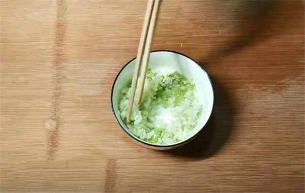 3.這個功夫咱們制作點蔥花餅的餡料,準備一顆大蔥,切成蔥花剁成蔥末,加一勺鹽,適量食用油,攪拌均勻備用。
