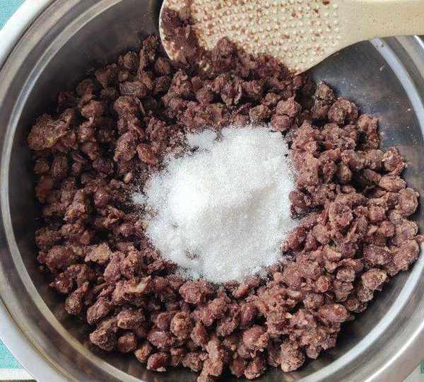 第11步、取出適量紅豆,加入適量白糖,攪拌均勻。