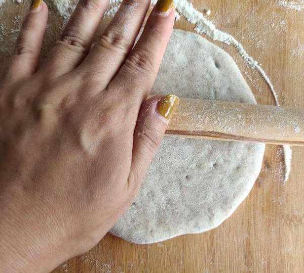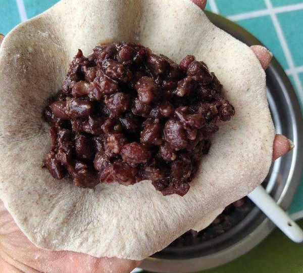 第15步、搟成中間厚四周薄的面皮,包上紅豆餡。
