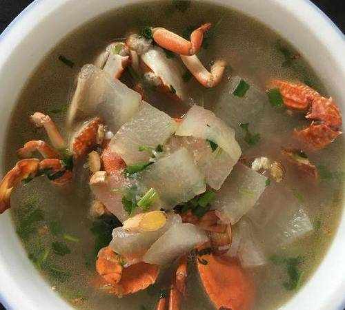 螃蟹:四隻、冬瓜:一斤、小蔥:兩根、香菜:一兩、鹽:適量、雞精:少許、食用油:適量、料酒:適量、淀粉:適量、十三香:適量