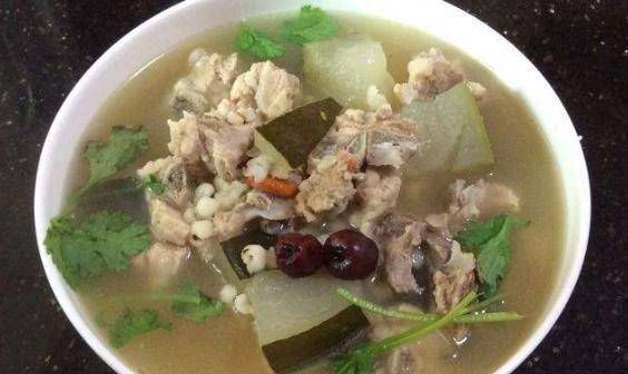 冬瓜:400g、排骨:500g、薏米:100g、薑片:4片、紅棗:4粒、蒜:3粒、鹽:適量、雞精:適量