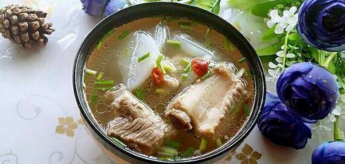 排骨:600克、白蘿卜:300克、枸杞:10克、蔥花:少許、薑:一小塊、鹽:少許