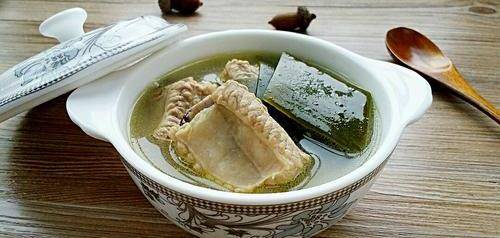 6、挑去蔥段和薑片,放入海帶繼續燉煮20-30分鐘至海帶熟爛,調入適量的鹽和雞精即可。