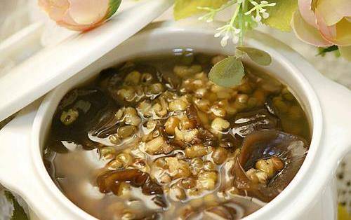 6、綠豆煮到開花軟瞭的時候倒入木耳。