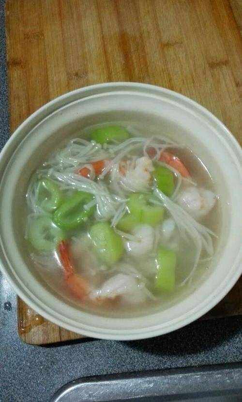6鍋裡放油倒入金針菇翻炒一下加水燒開,絲瓜沖洗幹凈後倒入,放少許鹽,燒一會後倒入蝦,關鍋蓋小火燒到絲瓜透明,撒些雞精就能出鍋瞭。