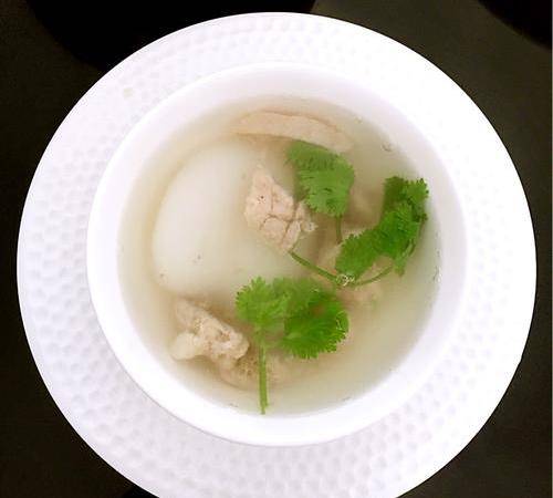 排骨:100克、海底椰:二個、豬肺:50克(處理好的)、香菜:一根、薑:三片、鹽:適量、雞精:少許