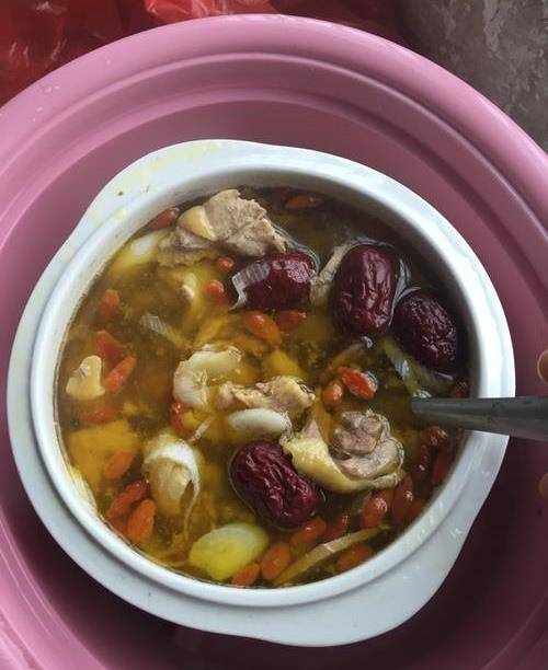 老母雞:半隻、人參:一根、當歸:少許、紅棗:5顆、枸杞:少許、大蔥:一段、鹽:5克、料酒:20克