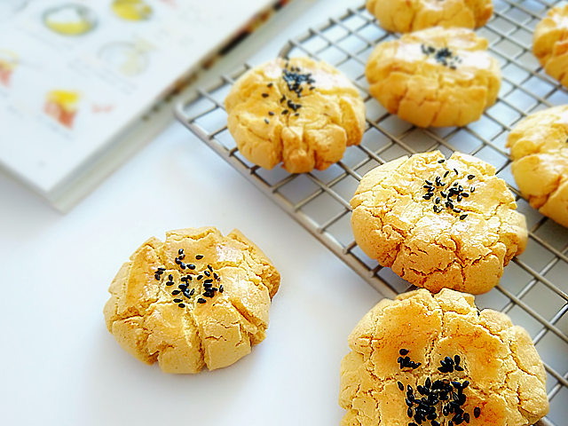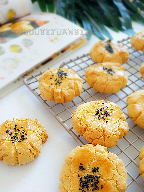 材料:低筋面粉200克,玉米油80克,糖50克,全蛋液40克,泡打粉2克,小蘇打1克,黑芝麻適量