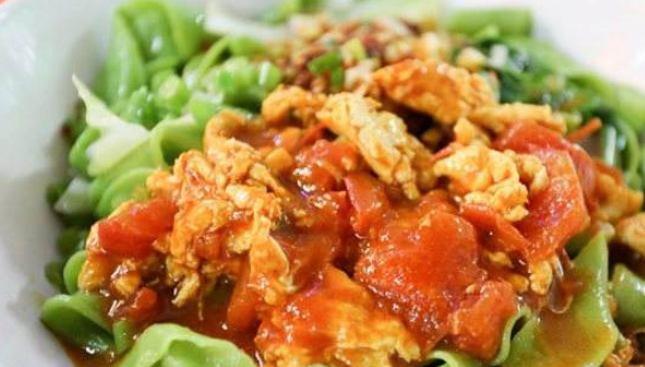 我嫂是最後的一個端出來她做的手工面,看上去就和平常的面條不一樣。她用菠菜打出瞭汁然後混合在面粉裡,搟成瞭寬面條。用的配菜還是西紅柿和雞蛋,下方還有紅蘿卜絲。作為新手媽媽的她還是從孩子這個角色出發瞭,平常小侄女兒不喜歡吃青菜,於是就想到這個辦法將青菜打成汁混合在面條裡面。