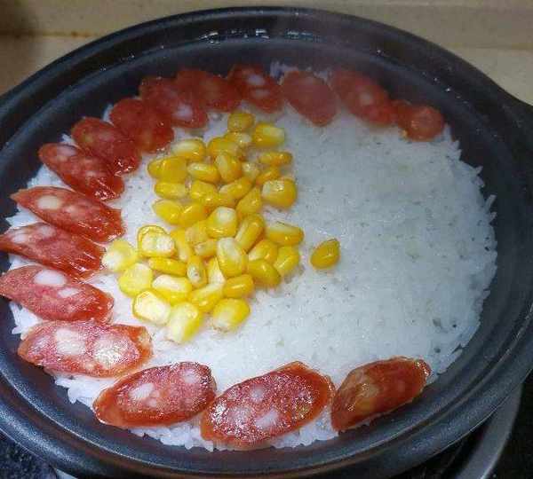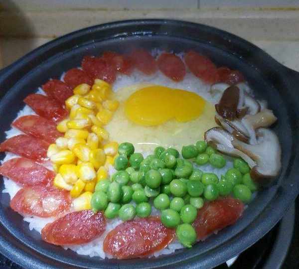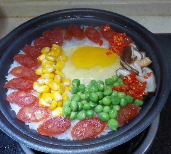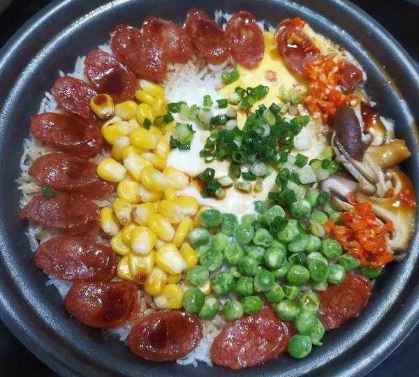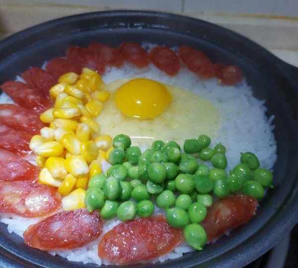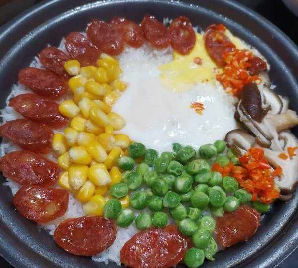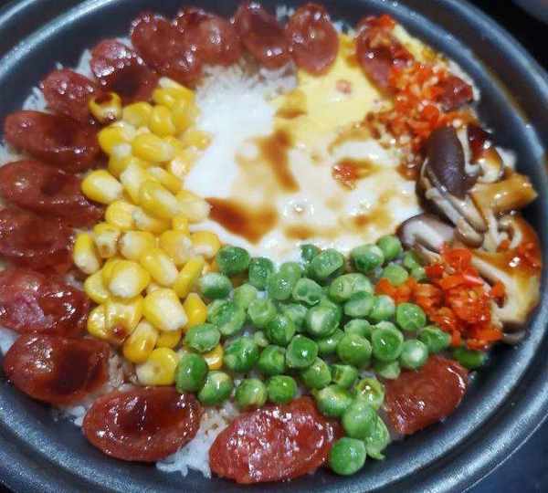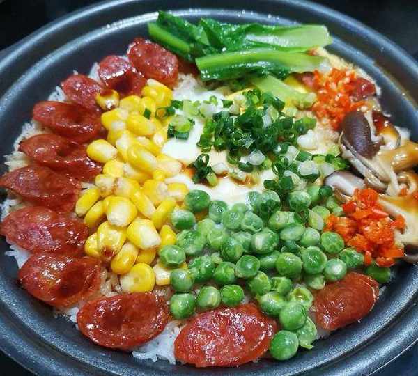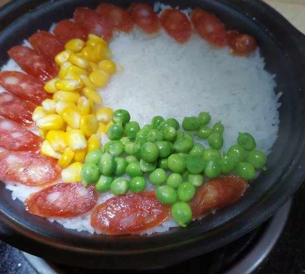 原料:絲苗米、水、香腸、玉米、豌豆、雞蛋、香菇、青菜、紅辣椒、玉米油、生抽、蠔油、白糖、芝麻油。