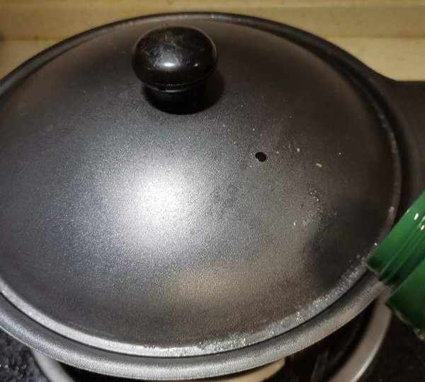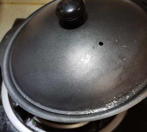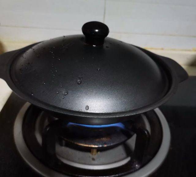 第4步、將砂鍋移至火上,大火煮開後立即轉小火,蓋上蓋子燜煮。