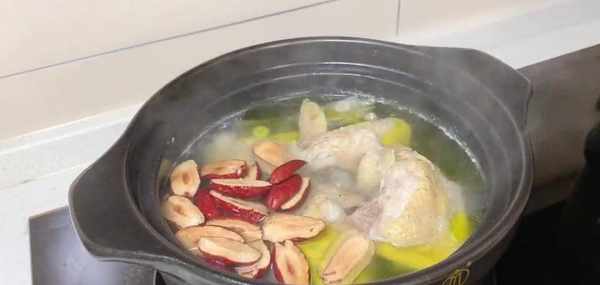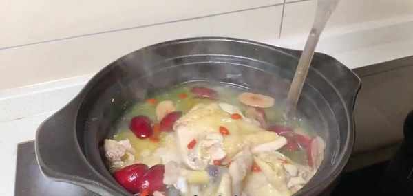 放進砂鍋裡,加入一把西洋參,西洋參不用放的太多。再倒入沒過食材的清水,煮開把浮沫撇掉,蓋上鍋蓋轉小火煲一個小時,一個小時後再把洗凈去瞭核的紅棗放進來,攪動均勻,蓋上鍋蓋繼續煲10分鐘,10分鐘後加入鹽調下味,再放入洗凈的枸杞攪動均勻。