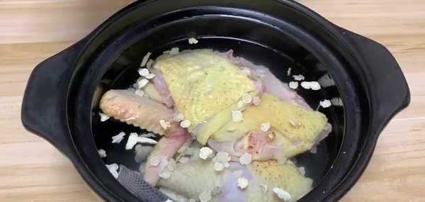 今天來做一個養生雞湯,可以有效增強中樞神經,達到消除疲勞、增強記憶力等作用,可以適用於失眠、煩躁、記憶力衰退及老年癡呆等癥狀。先來把雞洗幹凈,再剁成4大塊裝進碗中。煲湯之前我們要先把雞肉泡一個小時,把血水泡出來,這樣煮出來的湯透亮又沒有腥味。一個小時後我們再來把泡出來的血水倒掉洗幹凈。