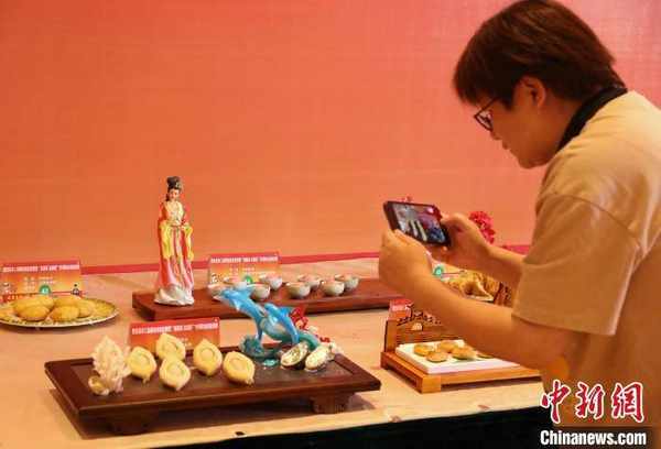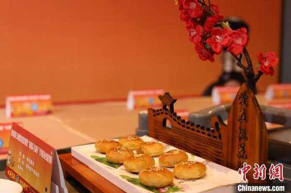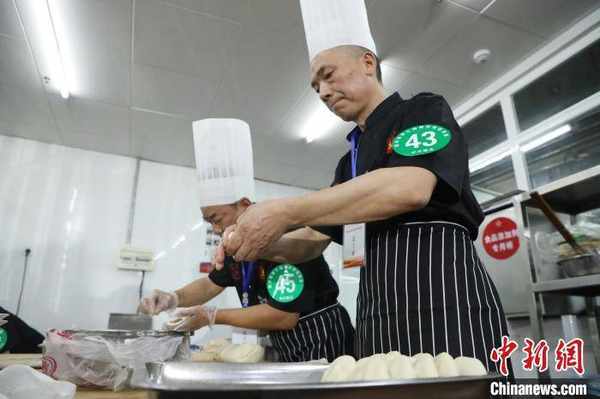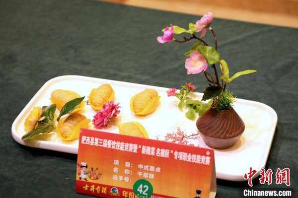 在肥西縣第三屆餐飲技能暨“新徽菜名徽廚”專項職業技能競賽現場,參賽廚師制作的徽式梅幹菜燒餅。 陳傢樂 攝