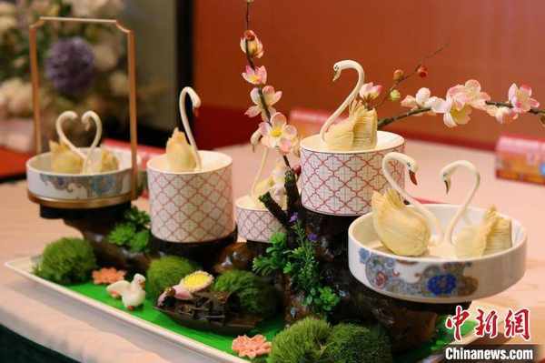 競賽現場,參賽廚師制作的天鵝酥。 陳傢樂 攝
