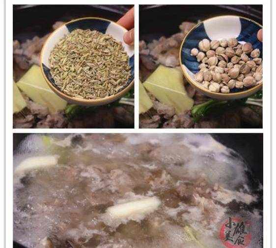 6、接著往砂鍋中再放入幾片薑片和一個蔥段,以及準備一小碗小茴香和一小把白蔻,這裡記住千萬不能放八角花椒等氣味重的大料。