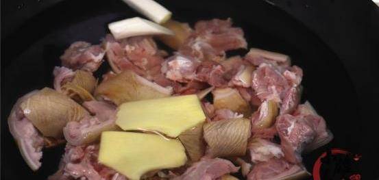 2、時間到,把羊肉控水撈出來,繼續用溫水洗一洗,羊肉充分洗幹凈以後,將其冷水下鍋,加入蔥段、薑片,以及一勺料酒進行焯水去腥。