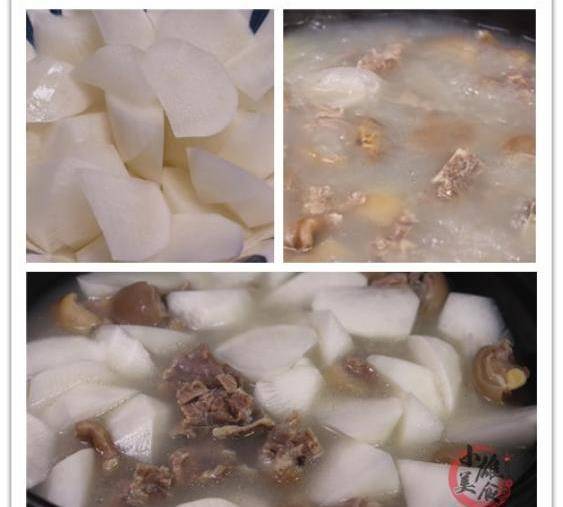 8、食材都放好以後,我們就可以蓋上蓋子,大火燒開後,轉中火燉上一個小時。燉制時間裡,我們要準備一個白蘿卜,將其去皮洗凈後,切成滾刀塊。