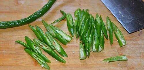 3.杭椒洗凈去蒂後斜切成長條形。