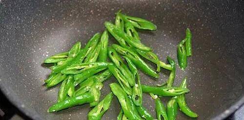 5.炒鍋燒熱不用倒油,將杭椒放入炒至表皮微軟略焦加少許鹽炒勻後盛出備用。