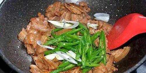 7.炒至肉片微微卷曲時加入大蔥段和杭椒翻炒。