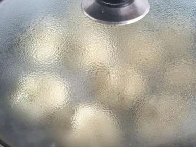 9、點火,平底鍋燒熱後,把小包子生坯擺到鍋裡,蓋上蓋子,煎制2分鐘左右,打開鍋蓋,加入一小碗水。再把鍋蓋蓋好,直到包子煎熟。大約時間是15分鐘。