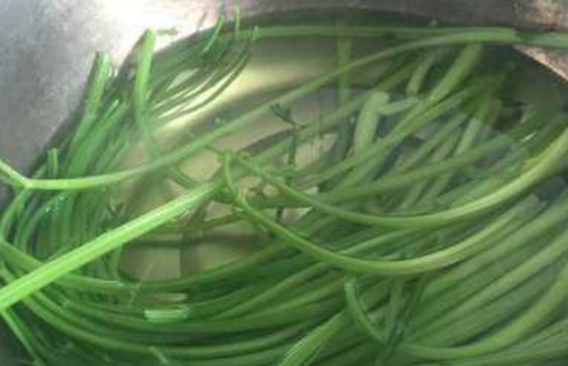 2、在餳面的時候,先來擇菜。洗凈,把適量的水放入盆中,點火,開鍋後分別把香芹梗、葉放入,焯一下。