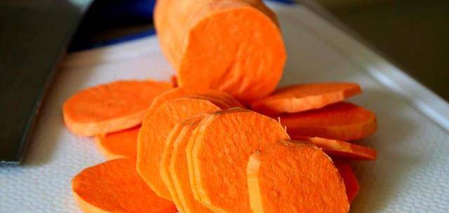 1、準備一個紅薯,最好是紅心薯,口感更好,再去皮切成薄片;
