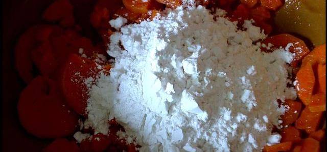 3、放涼後的紅薯片中,加入100克糯米粉和30克木薯粉,這個比例可根據紅薯的重量適當增減,加木薯粉一是為瞭固定形狀,二是可以增加紅薯圓子的彈性;