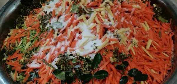 7.把所有切好的食材放入一個大盆中,加入適量的食鹽和新鮮花椒把它攪拌均勻。食材與鹽的比例是30:1搭配。