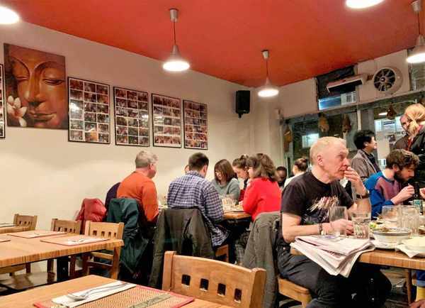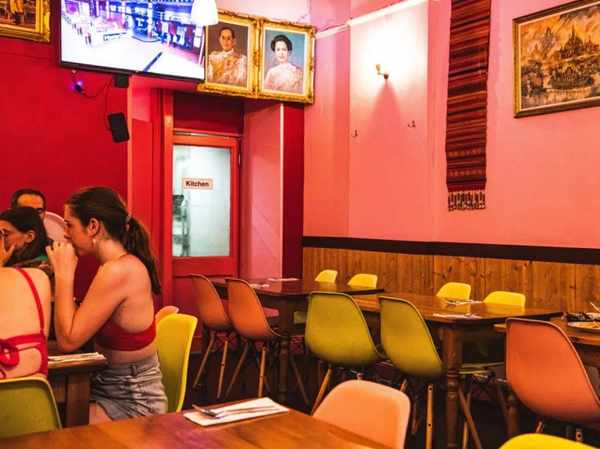 帶有斑駁金屬的桌椅,墻上僅有的裝飾是泰國王室的照片,因為餐廳人氣真的很高,所以用餐經常需要拼桌,許多在倫敦的泰國人都會經常來這裡吃個飯,可見這傢餐廳的泰國料理有多正宗啦。