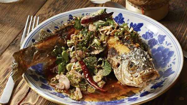 還有一道推薦菜是炸鱸魚,采用泰國伊善地區的做法,搭配香草和辣椒醬汁,連皮帶骨非常酥脆。