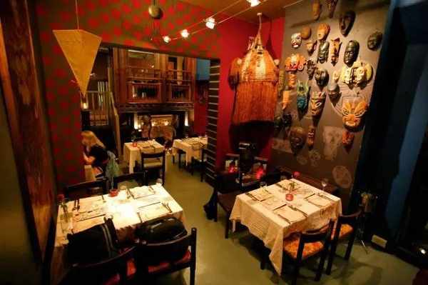 一推開門卻仿佛來到瞭另外一個世界,餐廳的墻被漆成明度極高的不同大色塊,掛著各異的面具,桌上橘紅色的泰式絲綢桌佈和小蠟燭都散發出餐廳獨有的調調。