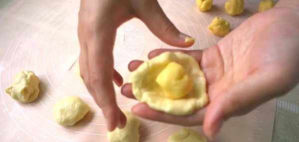 接下來把油酥塞進油皮裡面,全方位的兜住它,包的嚴嚴實實才有料。