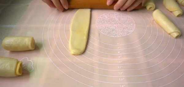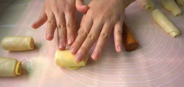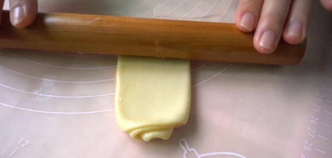8份都做完瞭還要再搟開一次,第二次搟開以後再卷起。