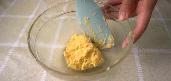 接下來準備油酥,在低筋面粉裡面加入黃油粒,拌成團就好啦。好吧最後我還是用瞭矽膠鏟,因為這個團實在是太黏啦。