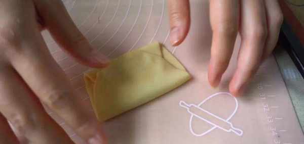 都卷好以後就把第一個卷好的拿出來,搟薄搟開,像折被子一樣對疊回來。