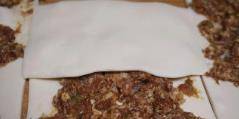 第10步,把肉餡均勻的抹在面皮上,然後上下左右各切1/3,最下角的一片不放入肉餡。